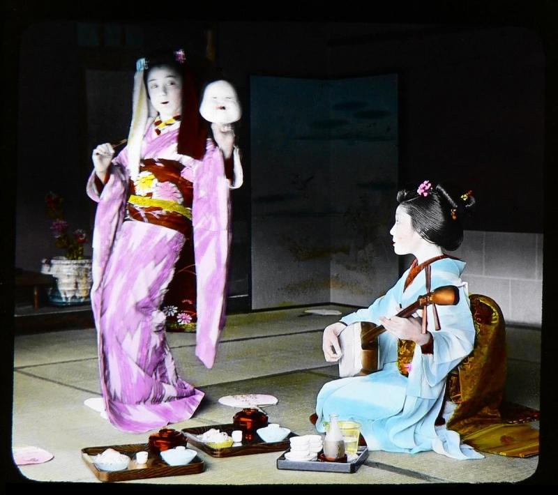 "S 26. Girls Looking at Pictures" A Maiko and two Geisha Looking at Stereoviews in Enami's Yokohama Studio. One of over 1000 cataloged 3-D images of old Japan.