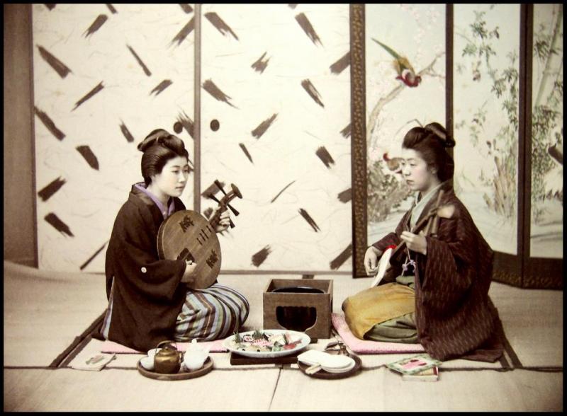 Two Geisha and a Maiko Looking at Stereoviews in T. Enami's Studio.Ca.1898-1907. A nice 3-D version of the above is shown on the Home Page. Scroll way down to see it.